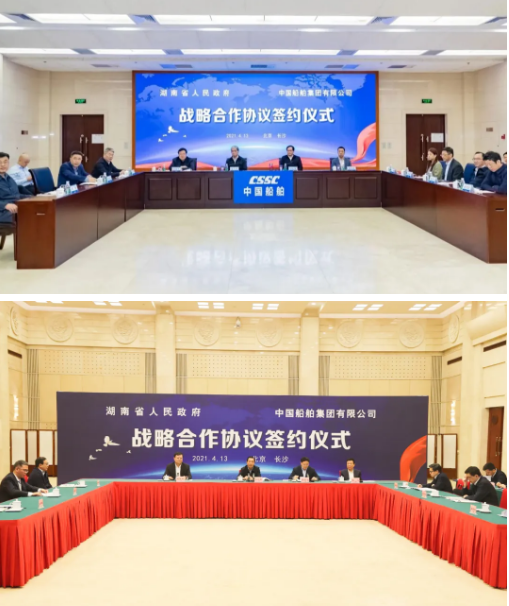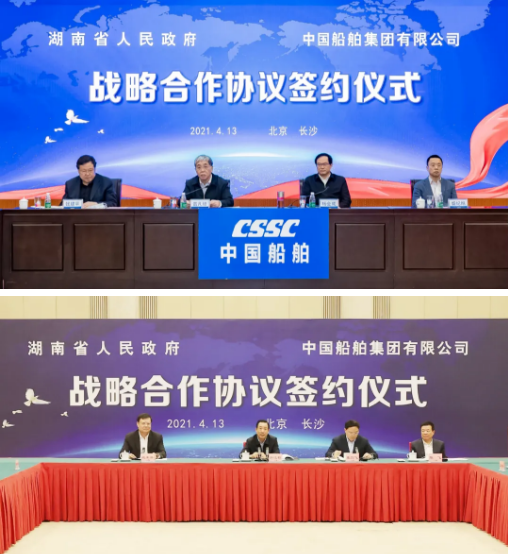 4月13日,中國(guó)船舶集團(tuán)有限公司與湖南省人民政府通過(guò)“云簽約”方式簽署戰(zhàn)略合作協(xié)議。中國(guó)船舶集團(tuán)黨組書(shū)記、董事長(zhǎng)雷凡培,黨組副書(shū)記、總經(jīng)理?xiàng)罱鸪桑h組成員、副總經(jīng)理盛紀(jì)綱,湖南省委書(shū)記、省人大常委會(huì)主任許達(dá)哲,省委常委、省委秘書(shū)長(zhǎng)張劍飛,省委常委、省國(guó)資委黨委書(shū)記姚來(lái)英出席簽約儀式。中國(guó)船舶集團(tuán)黨組成員、副總經(jīng)理錢(qián)建平,湖南省人民政府副省長(zhǎng)陳飛分別代表雙方在協(xié)議上簽字。簽約前,雙方圍繞共同服務(wù)國(guó)家戰(zhàn)略、深入推進(jìn)雙方戰(zhàn)略合作進(jìn)行了交流。