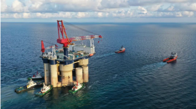 該平臺由下浮體、立柱和上甲板包組成,總長97.5米,寬度92米,高度118米,作業水深達52米,排水量17萬噸,依靠拖帶可在國內無限航區內航行、作業。